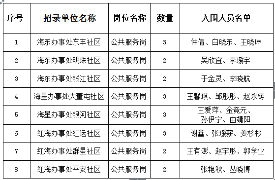 营口市鲅鱼圈区面向社会公开招聘2019年高校毕业生基层服务计划工作岗位20个,每个岗位按照考生考试成绩从高到低的顺序进行排名,依据考试成绩及招聘计划1:1等额确定入围人员。录取岗位的入围人员最后一名成绩并列,将进行加试。现将入围人员名单发布如下: